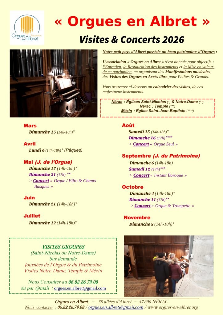 - Veiller à promouvoir la conservation, la restauration, et l’entretien des orgues de l’Albret : à Nérac, les orgues du Temple, des églises Notre-Dame et St-Nicolas ; à Mézin, l’orgue de l’église St-Jean-Baptiste. Ces objectifs s’effectuent en collaboration avec toutes les instances concernées (propriétaires, affectataires…).